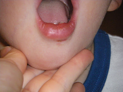 Wes was climbing up to the top of Livie's bed and fell hitting his chin on the bed on the way down. His tooth almost went all the way through. Poor guy.